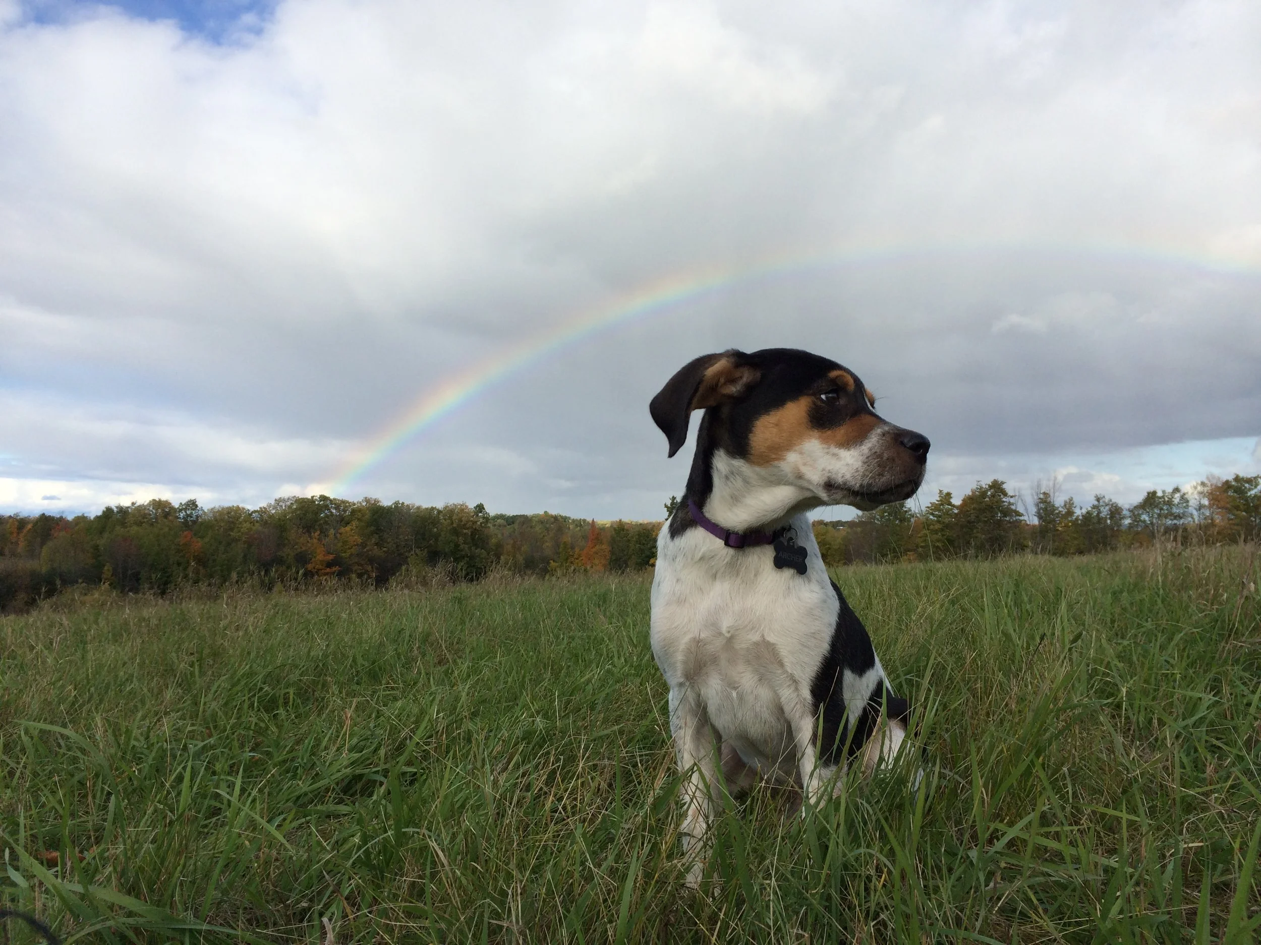 Your body lengthened, widened, and your snowy white patches became dense swaths of bluetick and redtick. Your tail, once dipped in a can of white paint, was stippled too with black spots. The arrow on your forehead that lent your name, morphed and compacted between your brows–I should have waited before permanently affixing its outline to my own skin. Ears stayed silken until the end. And the love that came, and how I changed, was more vast that I ever imagined.